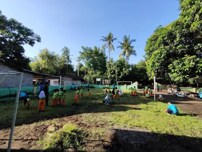 Semua murid dan para Guru gotong-royong melakukan kegiatan bersih-bersih lingkungan sekolah