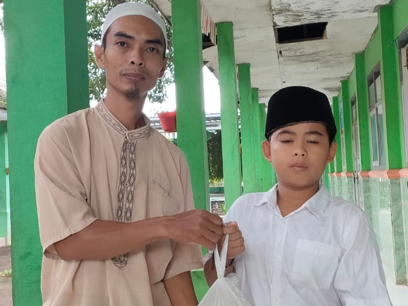 Penyerahan Zakat fitrah dari murid kelas 5 SDN 2 Wonokoyo yang di terima langsung oleh wali kelas lima Bapak Holek S.Pd